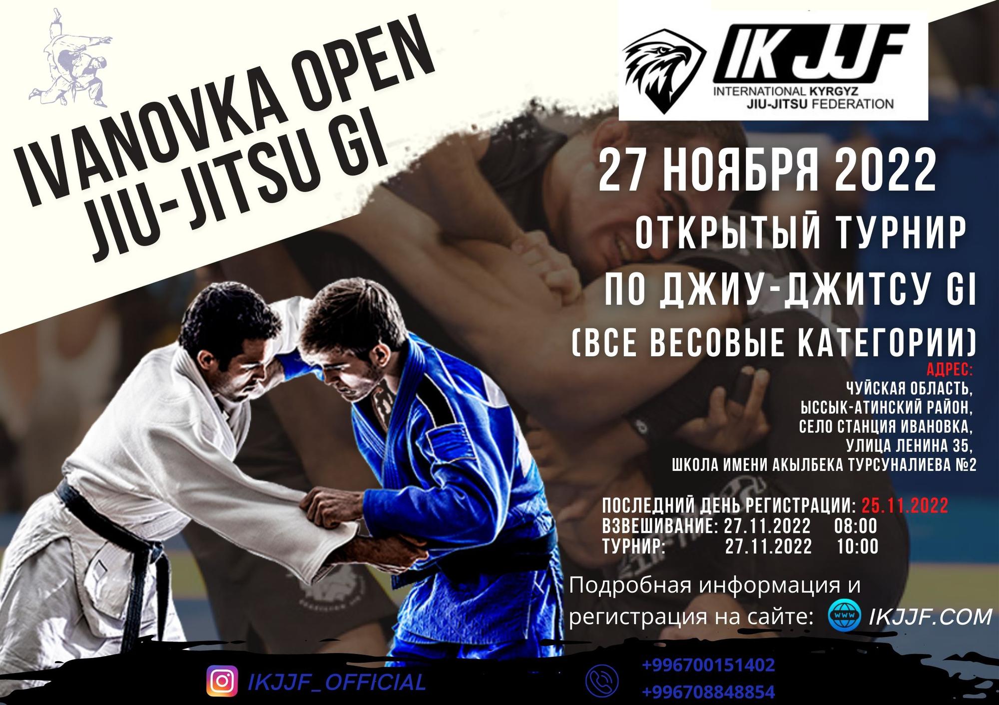ОО «Международная Федерация джиу-джитсу Кыргызстана» приглашает Вас на Открытый турнир по джиу-джитсу “IVANOVKA OPEN JIU-JITSU GI, NO GI”, который состоится 27 ноября 2022 года по всем возрастным категориям