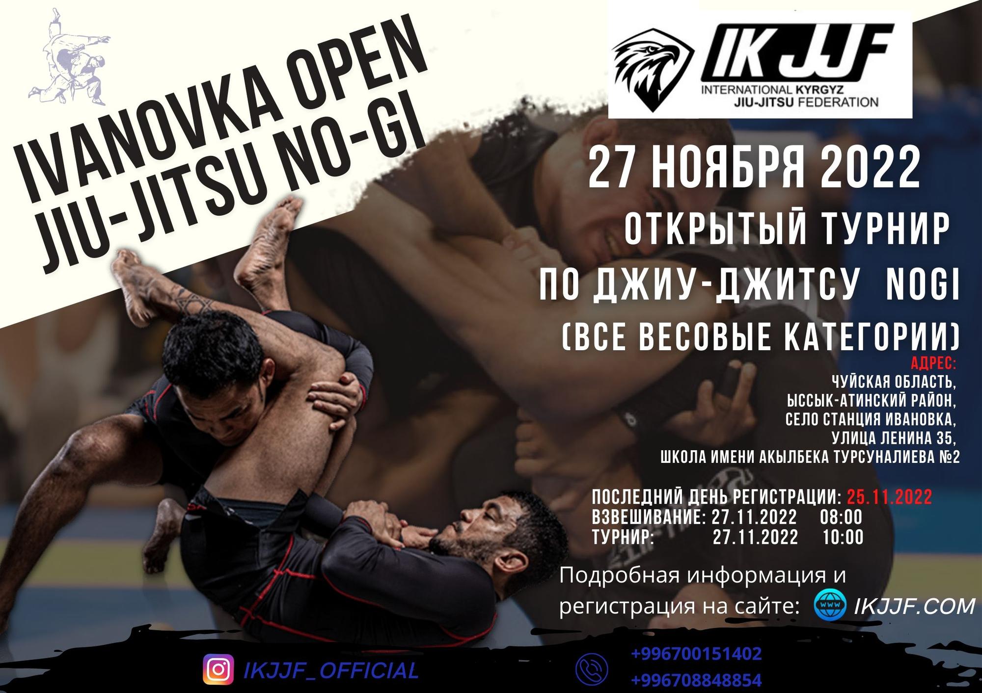ОО «Международная Федерация джиу-джитсу Кыргызской Республики» приглашает Вас на Открытый турнир по джиу-джитсу “IVANOVKA OPEN JIU-JITSU GI, NO GI”, который состоится 27 ноября 2022 года по всем возрастным категориям